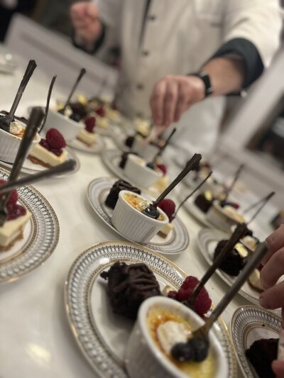 Our services range from intimate, private seated dinners for 8 to 10 guests and sophisticated hors d’oeuvre parties for 15 to 30 guests, to large-scale weddings and corporate functions accommodating up to 300 attendees.